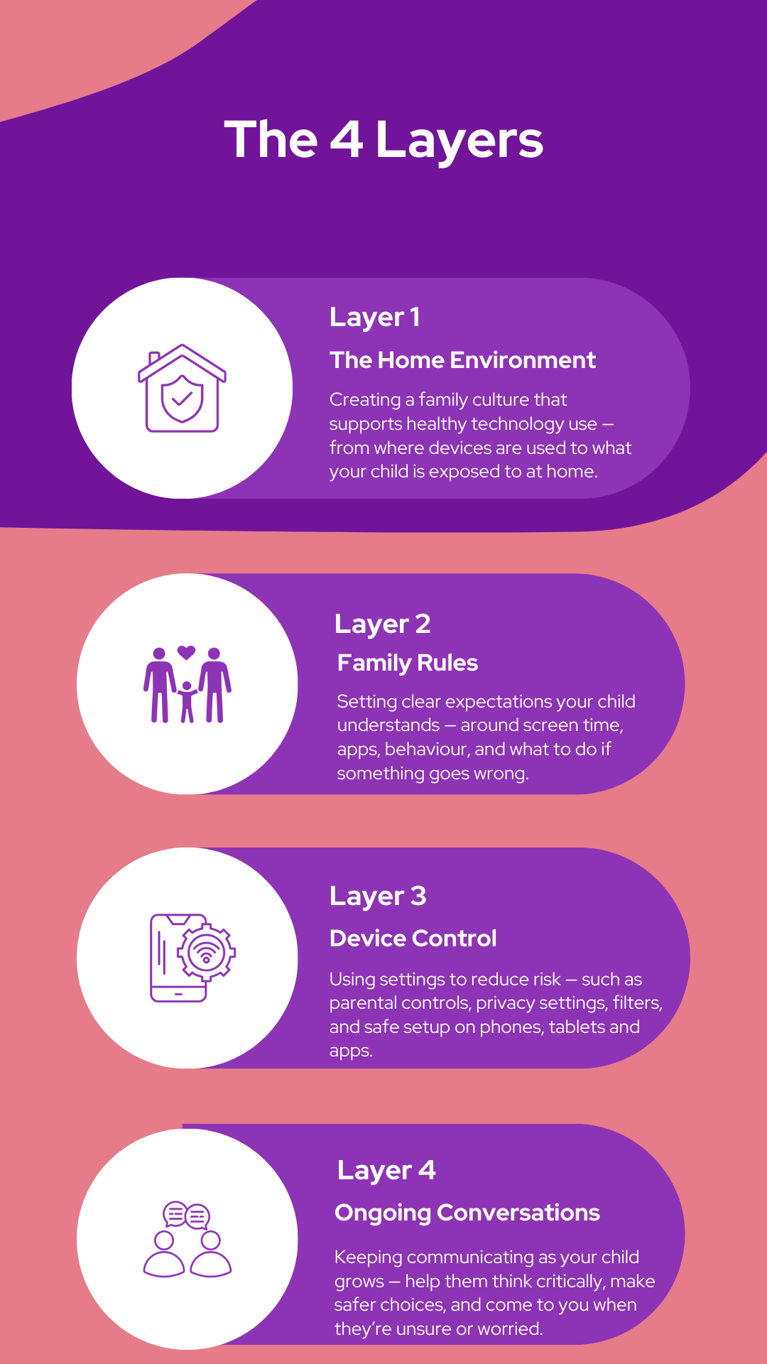 Online safety isn’t about one setting, one rule, or one “perfect” solution. It’s built in layers. Each layer works together to reduce risk, build healthy boundaries, and support your child as they grow.